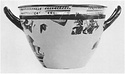 | Description: | Foot missing; upper part mended from numerous fragments and restored in plaster. High bowl, concave lip, steeply canted handles, from shoulder to above rim. A: Left to right: figure moving right; looking back over shoulder; bearded man seated on small chariot, pulled by two horses, facing right; olive tree in background; bearded male touching horses' heads, facing left; bearded male moving right, looking back over shoulder. B: Left to right: draped female moving right; second figure moving right; much of center missing except for shoulder and back of head of figure moving right; upper half of bearded male moving right, looking back; upper half of bearded satyr moving right, looking left; olive tendrils in background. Figures in black with incised detail and added purple; diluted glaze for limbs, faces, spots on horses. Decoration of lower wall: elongated tongues surmounted by bands of glaze. Decoration of lip: two rows of ill-defined vine leaves. Generally good black glaze; Attic clay. | |
