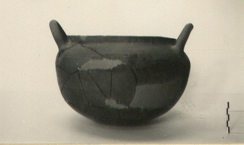 | Description: | Mended from many pieces. Restored in plaster. Horizontal handles, rim deeply grooved to receive lid. Rounded bottom. Two shallow grooves encircle body under handles. Under one handle, incised: A Reddish-buff clay, white bits. | |