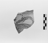 Incision; purple on neck, ears, eye, stripes on flank, petals of rosettes(?). Unglazed inside except for neck.