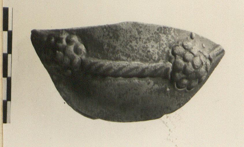 | Description: | Fragment broken all around. Part of forehead with taenia and fruits. Pinkish-buff clay. Red glaze, worn. ADDENDA "Knidian" fabric (JWH). | |