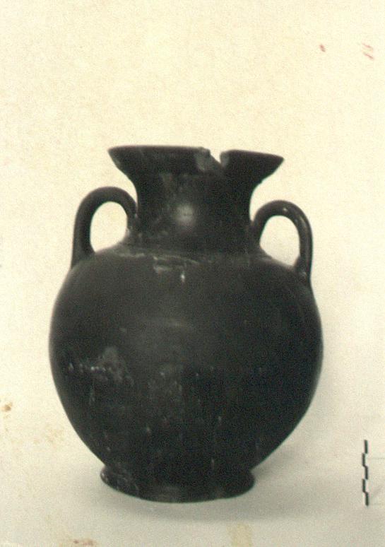 | Description: | Mended from numerous fragments. Missing: one handle, more than half of wall and small fragments from lip, neck and foot. Almost entirely restored in plaster. Flaring mouth, flat on top. Ridge at beginning of neck and double ridge at handle zone. Band handles, rounded body, flaring ring foot. Reserved on top of rim and underneath foot. Black glazed inside rim to the beginning of neck. Dull glaze; clay rather porous and gritty. Five fragments, apparently found after plastering, now inside pot. ADDENDA Possibly Laconian? The clay resembles the series of later black vases from Bourboura (Rhomaios, N.M.) 0n the Laconian krater rim fragment P 22309 the clay is less red, but has a similar gritty character. P 4996 probably goes with these. | |
