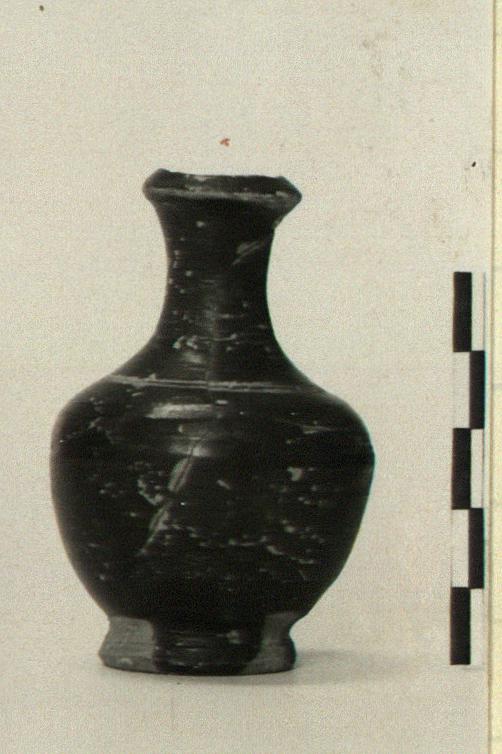 | Description: | Broken but complete save for mouth and neck fragments; chipped. Plump shape; narrow neck; high foot. Incised line on shoulder. Light brown clay. Glossy glaze on outside, chipped. | |