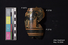| Description: | Fragment from upper part of wall depicting head of youth behind quadriga. The necks of three horses (one white between two black) preserved. Behind, a youth facing left; only his head remains. White (in addition to the horse), for the fillet of the youth, dots in the field at the edge of the upper border and small dots on the outer horse's back (harness?). Joins P 2739 and P 2719. | |