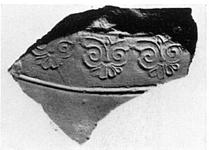 | Description: | From the shoulder of a pithos. Three stamped palmettes from the zone decorating the shoulder at the point of junction with the neck. Reddish-buff coarse clay with bits. | |