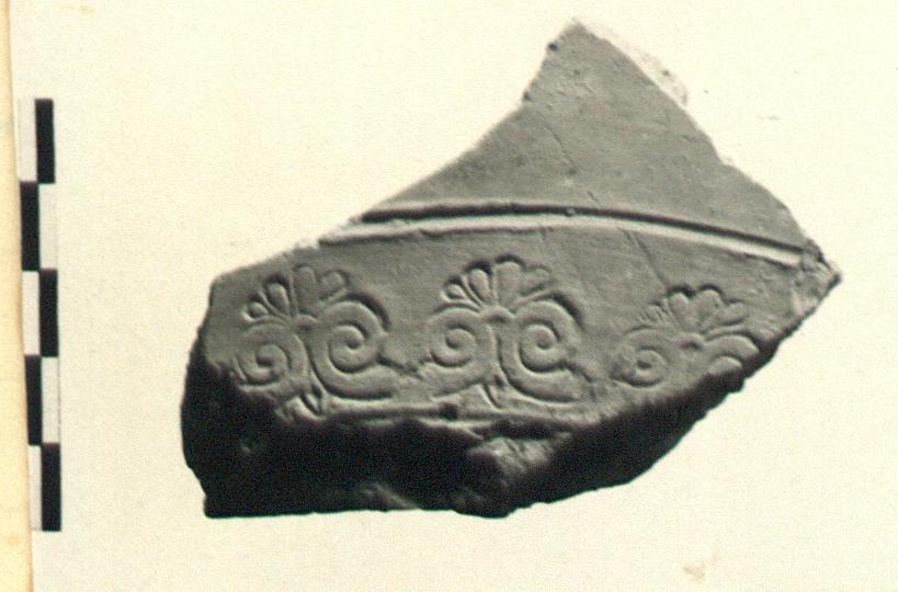 | Description: | From the shoulder of a pithos. Three stamped palmettes from the zone decorating the shoulder at the point of junction with the neck. Reddish-buff coarse clay with bits. | |