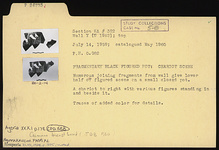 | Description: | Numerous joining fragments from wall give lower half of figured scene on a small closed pot. A chariot to right with various figures standing in and beside it. Traces of added color for details. | |