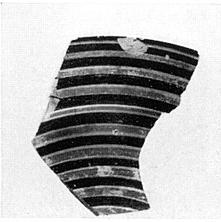 | Description: | Two joining fragments give part of rim and bowl, and a handle stub. Outside resembles a lip cup with offset lip. Inside banded alternately red and black. Black glaze firm on outside, and metallic inside. Red glaze dull. Light brown clay. | |