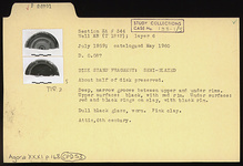 | Description: | About half of disk preserved. Deep, narrow groove between upper and under rims. Upper surface: black, with red rim. Under surface: red and black rings on clay, with black rim. Dull black glaze, worn. Pink clay. Attic. | |
