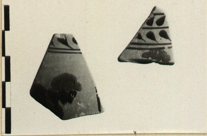 | Description: | From wall and shoulder of small closed vase. a) Head and shoulders of youth to right with (?) spear; above, band of fine-pointed leaves. b) Top of head of youth above, as in fragment a). Added red for hair. | |
