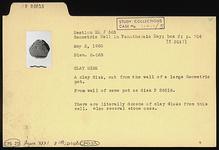 | Description: | A clay disk, cut from the wall of a large Geometric pot. From wall of same pot as disk P 26816. There are literally dozens of clay discs from this well. Also several stone ones. | |