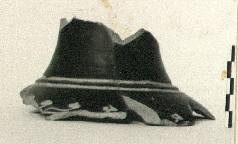 | Description: | Lower neck and beginning of shoulder preserved in two joining fragments. Two grooves through glaze at juncture of neck and shoulder. Ivy garland in applied clay around shoulder. Dull but firm black glaze; clay buff to red. | |