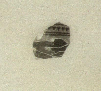 | Description: | From a closed pot, showing hand and thighs of youth, right. Careful incision, including the contours. The two border stripes brown; the leaves black. Orange wash; no accessory color. Unglazed inside; thin fabric. | |