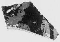 | Description: | Broken all around. Head of girl to right, holding thin object in left hand. White for headband, necklace, bracelet and earrings. Inside glazed, with beginning of reserved area above. Shiny black glaze. ADDENDA Maenad: she wears a nebris on her left shoulder and holds a thyrsos. | |