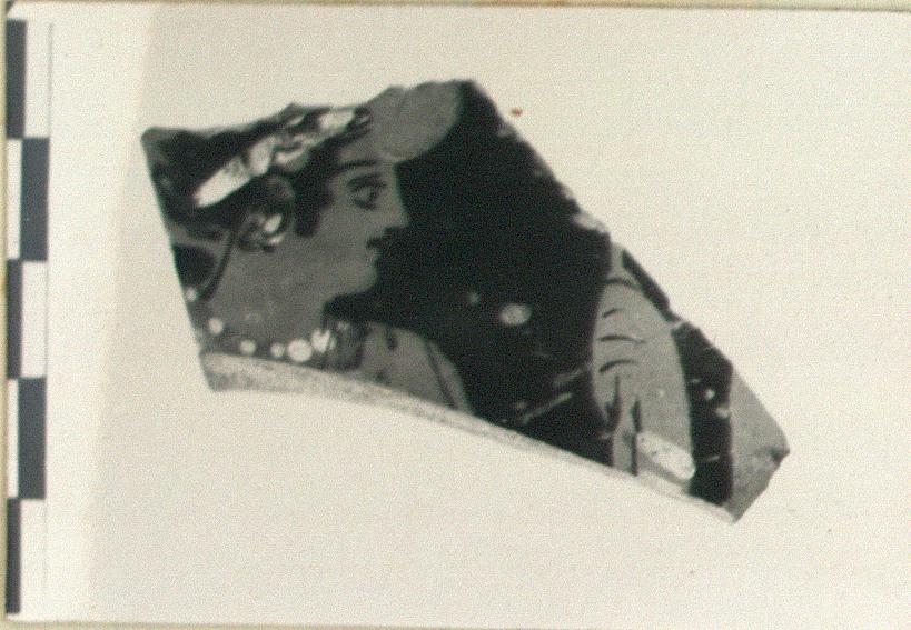 | Description: | Broken all around. Head of girl to right, holding thin object in left hand. White for headband, necklace, bracelet and earrings. Inside glazed, with beginning of reserved area above. Shiny black glaze. ADDENDA Maenad: she wears a nebris on her left shoulder and holds a thyrsos. | |