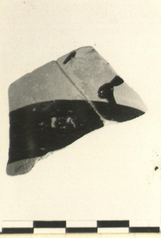 | Description: | Two joining fragments from lower wall; broken all around. On a broad black band a human foot to right. Pink clay. | |