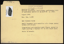 Description:   Small fragment from medallion of a large plate; broken all around. Long-haired and wreathed male figure seated to right holding a thyrsos(?) in his right hand. White on wreath.
