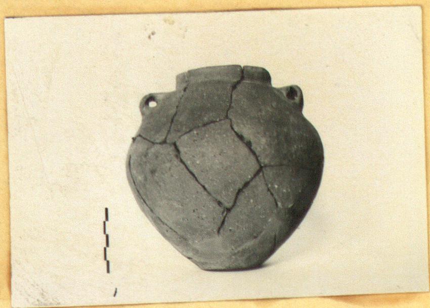 | Description: | Mended from many fragments; complete except for small pieces. Biconical with straight rim, flattened base; two lugs pierced horizontally set high on shoulder. Gritty buff clay with thin red burnished slip; mottled black and buff as if deliberately from coals. | |