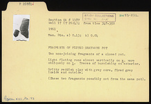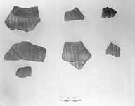 | Description: | Two non-joining fragments of a closed pot. Light fluting runs almost vertically on a), more obliquely on b). Traces of burnishing on exterior. Gritty reddish clay with gray core, fired gray inside and outside. N.B. These fragments possibly not from the same pot. | |