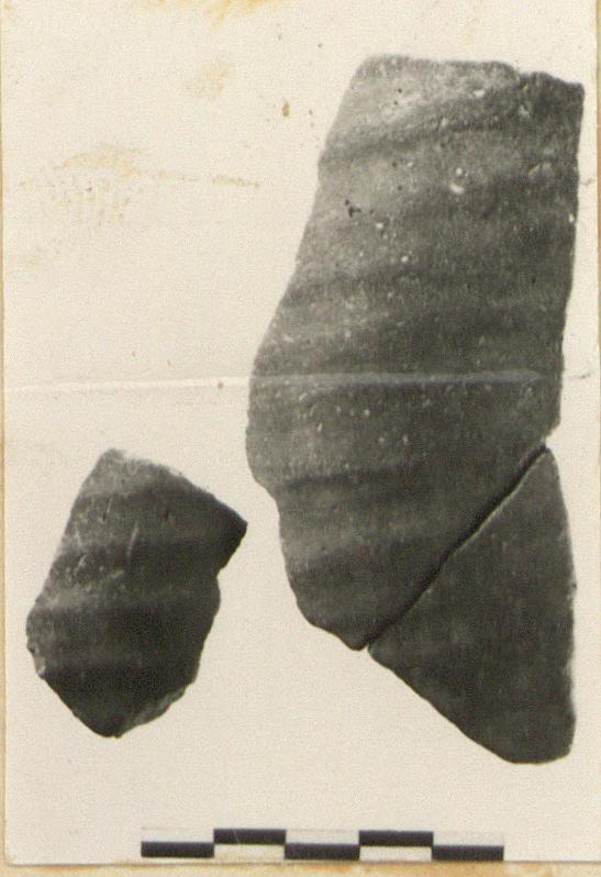 | Description: | Two non-joining fragments of a closed pot. Light fluting runs almost vertically on a), more obliquely on b). Traces of burnishing on exterior. Gritty reddish clay with gray core, fired gray inside and outside. N.B. These fragments possibly not from the same pot. | |