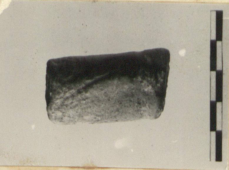 | Description: | Broken at both ends. Light diagonal incision. Gritty gray clay, traces of red slip. | |