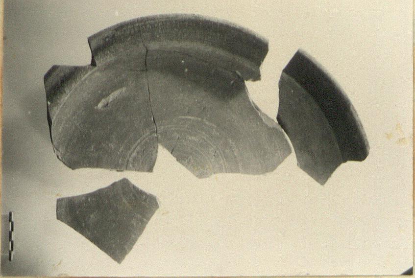 | Description: | a) Mended from five fragments preserves profile; about one-third of the vessel. b) Non-joining rim fragment. c) Floor fragment. Hollowed out base, flaring rim. Two zones of stamped decoration at center of floor bound by grooves: inner palms, outer circles. Late Roman C. | |