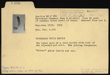 | Description: | The lower part of a flat handle with some of the adjacent pot wall. Two joining fragments. "Silver" glaze inside and out. | |