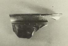 | Description: | Mended from five pieces, preserving part of rim and upper wall. Left to right: three horses, winged(?), two black, one white; helmeted female figure looking toward horses; tip of wing of sphinx(?) Upper parts only of all figures preserved. White for flesh of woman, dots on her helmet, one horse and ornament on harness. Upper border of two rows of black dots separated by band of dilute glaze on reserved band. Reserved, a band around inside of rim. ADDENDA A sixth fragment adds a bit of rim at left. | |