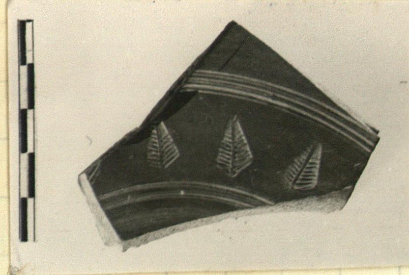 | Description: | Floor fragment of dish(?). Narrow band of stamped palm branches, enclosed by grooves. Fine orange-red clay with pinkish tinge; thin smooth slip. Late Roman Red Ware. | |