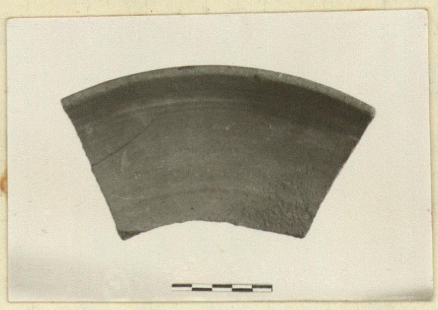 Fragment of rim and wall; base missing. Shallow curving floor, vertical rim.