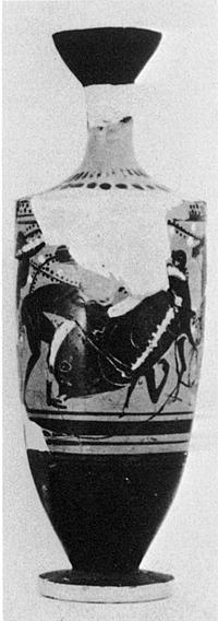 | Description: | Mended from six pieces; the foot restored in plaster. Mouth, most of back and part of side and front walls missing. Herakles wrestling with boar between Athena on horseback and another rider (only the feet of horse and part of garment preserved), facing. White for flesh of Athena, mane and outline of underside of body of boar, Herakles' club and strap(?) over his shoulder, fruit of vines in field. Red for parts of Athena's helmet, mane of horse, stripes on garments, dots and stripe on boar, Herakles' fillet and two horizontal lines over the glaze below the scene. Shoulder decorated with debased lotus bud pattern. Glaze fired red in back. Joins P 2722. | |