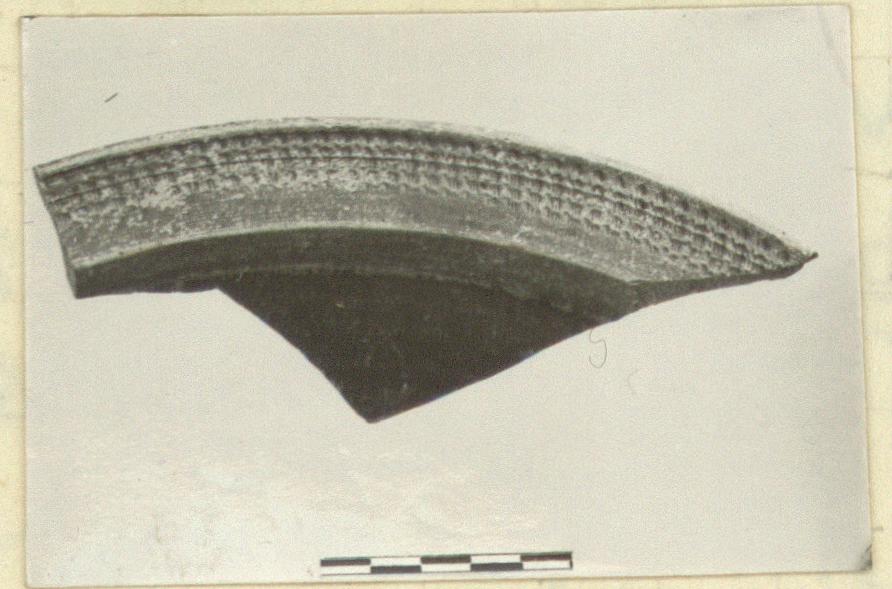 Rim fragment of Late Roman dish. Flat rim, low wall, sloping foor. Five lines of rouletting on rim.