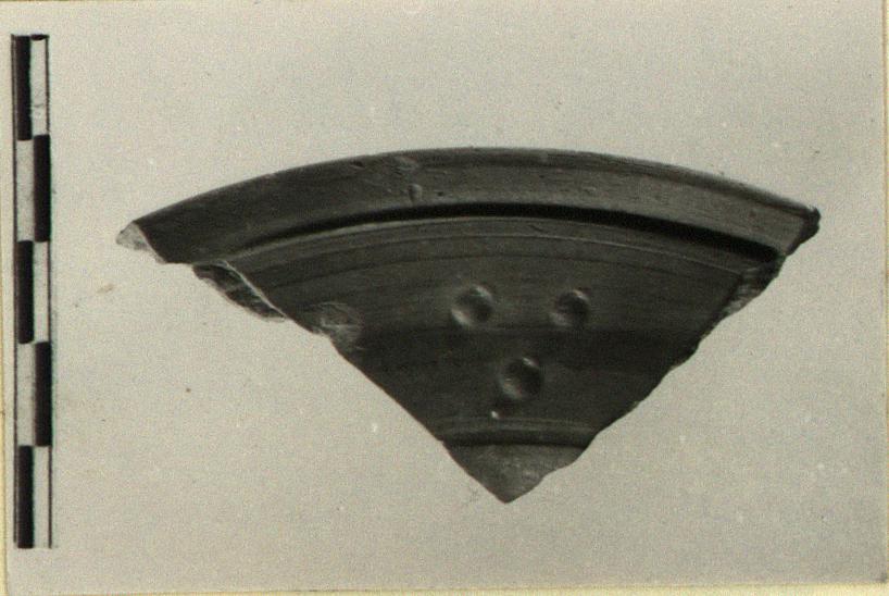 Rim fragment of a small bowl. Broad flat rim, thickened at lip, bearing three punched knobs arranged in a triangle.
