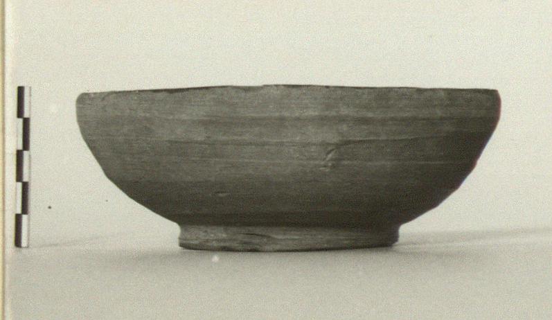 | Description: | About one-fourth missing from rim and wall. False ring foot, rounded walls, plain lip. Brown clay; thin grayish-brown glaze on interior. | |