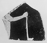 Description:   Broken all around. From small plate? Figure to right, arm outstretched holding stick(?) vertically downward. Circular black concentric rings on reserved surface, on reverse.