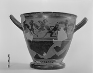 | Description: | Mended from many pieces; restored in plaster. Inside, black glazed with a central reserved circular space decorated with dot and circle; the inner edge of the lip reserved. Outside, beneath the edge of the rim, vine dot border; brown and black bands above and below the figured zone. The junction of foot and body, and ca. 0.027m. above it, reserved, and decorated with short rays, black to brown, between brown lines. The heavy ring foot squared on the outside, flaring beneath, black glazed, with the resting surface reserved. Within the foot, reserved; decorated with two concentric circles around central dot. On each side six figures: A. Left to right: Amazon attacking falling warrior; warrior attacking falling Amazon; two warriors, the first on horseback. B. Amazon right; warrior left, looking right; Amazon attacking falling warrior; warrior, and Amazon, left. White for the flesh of the Amazons; the crests of the helmets of all the figures and circle devices on all the shields; the cloak of the mounted warrior. The legs of the Amazons are painted in black only as far as the knee. Below this, the white is added directly over the clay ground. Orange wash. | |