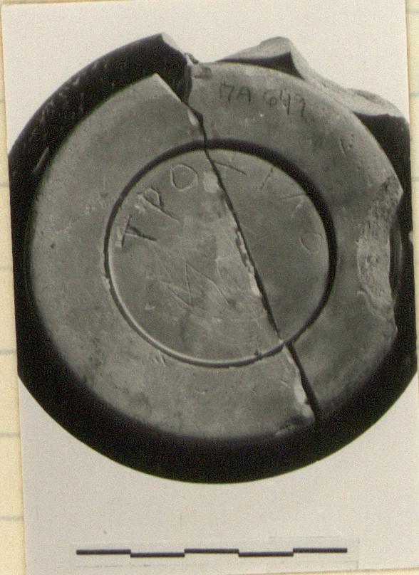 | Description: | Mended from two fragments; small parts missing from rim and foot; much chipped. Low flat foot with raised center; low flaring sides; wide inturned rim. Glazed inside and out; base reserved except for inside step between foot and center of base. Graffito on center of base: <graphic> Orange clay; good black glaze. | |