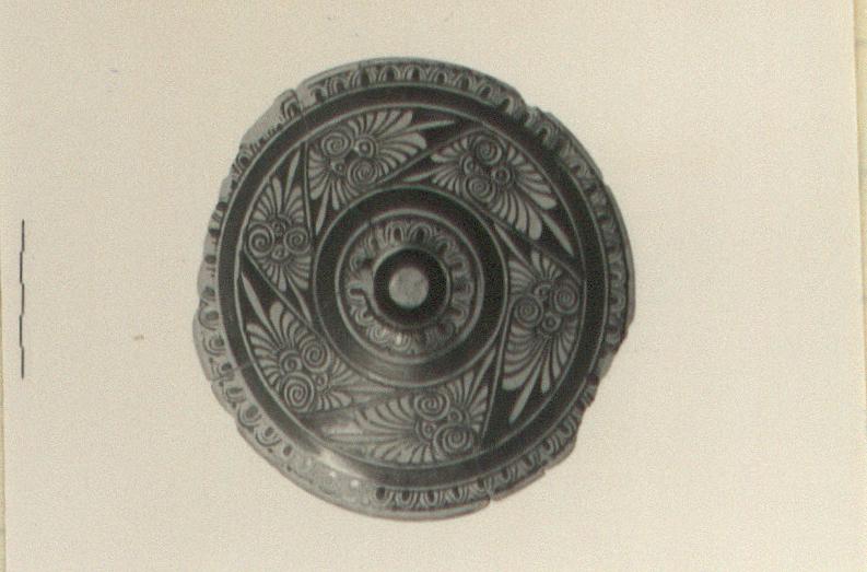 | Description: | Mended from three fragments. Knob broken off; rim chipped. Round with high-stemmed knob; sloping up toward center. Concave flange. Band of tongues around rim and around base of knob; band of double palmettes around middle. Outer face of flange black glazed. Underside reserved except for wide and narrow bands. Pink clay. | |