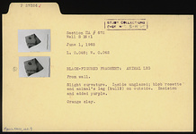 | Description: | From wall. Slight curvature. Inside unglazed; blob rosette and animal's leg (bull?) on outside. Incision and added purple. Orange clay. | |