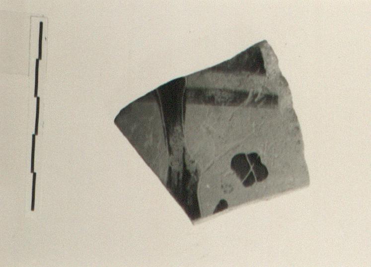 | Description: | From wall. Slight curvature. Inside unglazed; blob rosette and animal's leg (bull?) on outside. Incision and added purple. Orange clay. | |