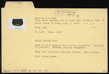 | Description: | Much of wall missing but profile complete. Restored in plaster. Several joining fragments. High wall slightly inclined inward. Flat bottom. Dull black glaze. | |