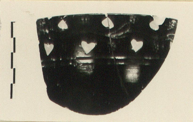 | Description: | Two joining fragments from rim and upper wall. Thick, almost vertical wall. Around top of wall an ivy wreath with tendrils in white paint, leaves in applied clay. Below, two white bands. Firm black glaze. ADDENDA Rather a skyphos, type B (Bloesch). | |
