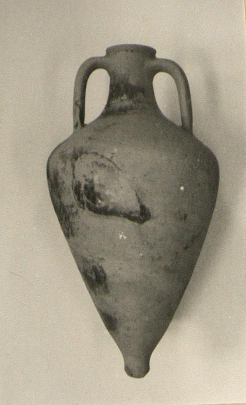 | Description: | Complete except for fragment missing from mouth; foot heavily chipped. Knob foot; elongated body; sloping shoulder; depression at base of each handle; almost straight rim. Gritty orange-buff clay. Traces of resin inside. | |