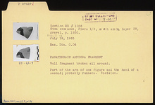 | Description: | Wall fragment broken all around. Part of the arm of one figure and the hand of a second; probably runners. Incision. | |