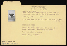 | Description: | Broken but lacks only small fragments of one handle and wall. Completely restored. Very irregular in shape. Coarse clay; unglazed. | |