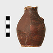 | Description: | Mouth and handle missing, but one small non-joining fragment of the mouth remains. Mended from many fragments and partially restored in plaster. Trefoil mouth, slender body; low offset foot, concave underneath. Glazed except for underside. Thin brown glaze with prominent brush strokes. Pink buff clay. | |