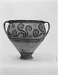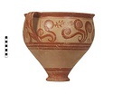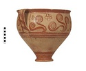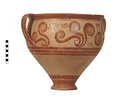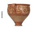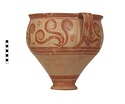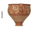 | Description: | Mended from thirty-one pieces. One piece missing below handle; rim chipped. Somewhat restored in plaster. Tall amphoroid krater with torus-disc foot, vertical strap handles from belly to rim, out-turned rim. Rim and foot glazed solid; handles edged with vertical bands, crossed with diagonal bars, framed by thin vertical stripes at ends of 'picture field'; three bands below handles, one above foot. Decoration of three curtailed Argonauts sailing left on each side with conventional formulaic seaweed and trefoil rockwork or rosette motives above and below. Argonauts go over side stripes and touch top stripe. Pale buff clay full of grit and pocks, prominent wheel ridges, fine buff slip, clear light red glaze. Probably Furumark, MP type 6 (III A:1) or 7 (III A:2 early), motive 22, no. 16 (III A:1) 17 no. 18 (II B-III A:1). | |