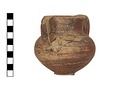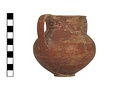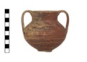 Description:   Complete but for chips from wall; mended from sixteen pieces. Same type as P 27448, but two vertical strap handles from rim to belly, faint ring foot nicely profiled, body well articulated. Paint all over outside and inside neck to 0.025m. Splash of paint under foot.