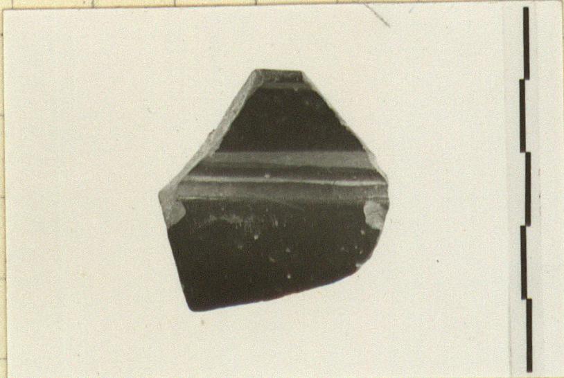 | Description: | Upper wall and lip, with a bit of rim, of high-footed cup. Body glaze running just onto lip, then a broad band containing a loose zigzag in thinned glaze, the lower bays of which have been filled in with black glaze. Another band on rim; reserved stripe on lip inside. Hard pale buff to gray clay, probably from smoke. Dull adherent black glaze of good quality. | |