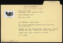 | Description: | Two joining fragments preserve about one-third of rim and wall. Shall Early Roman cup with thin vertical wall. Groove halfway down wall. Stumps of a handle visible. Orange clay, gray in places on outside. Early Roman. Cf. P 16193. | |