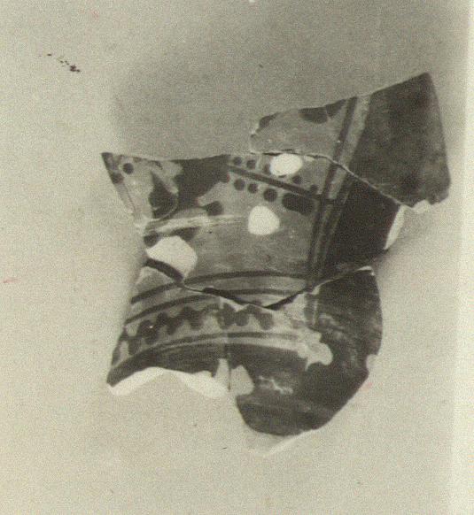 | Description: | Mended from four pieces preserving part of the neck and shoulder and the upper left corner of the figured panel. Glazed inside to the bottom of the neck. Uncertain object in lower left corner, behind bearded figure. Vine in field. Red for fillet and beard and for a stripe around the neck of the pot above the panel. White for fruit of vine. A groove made before the pot was decorated runs across the figure's head. Traces of white in it(?). | |